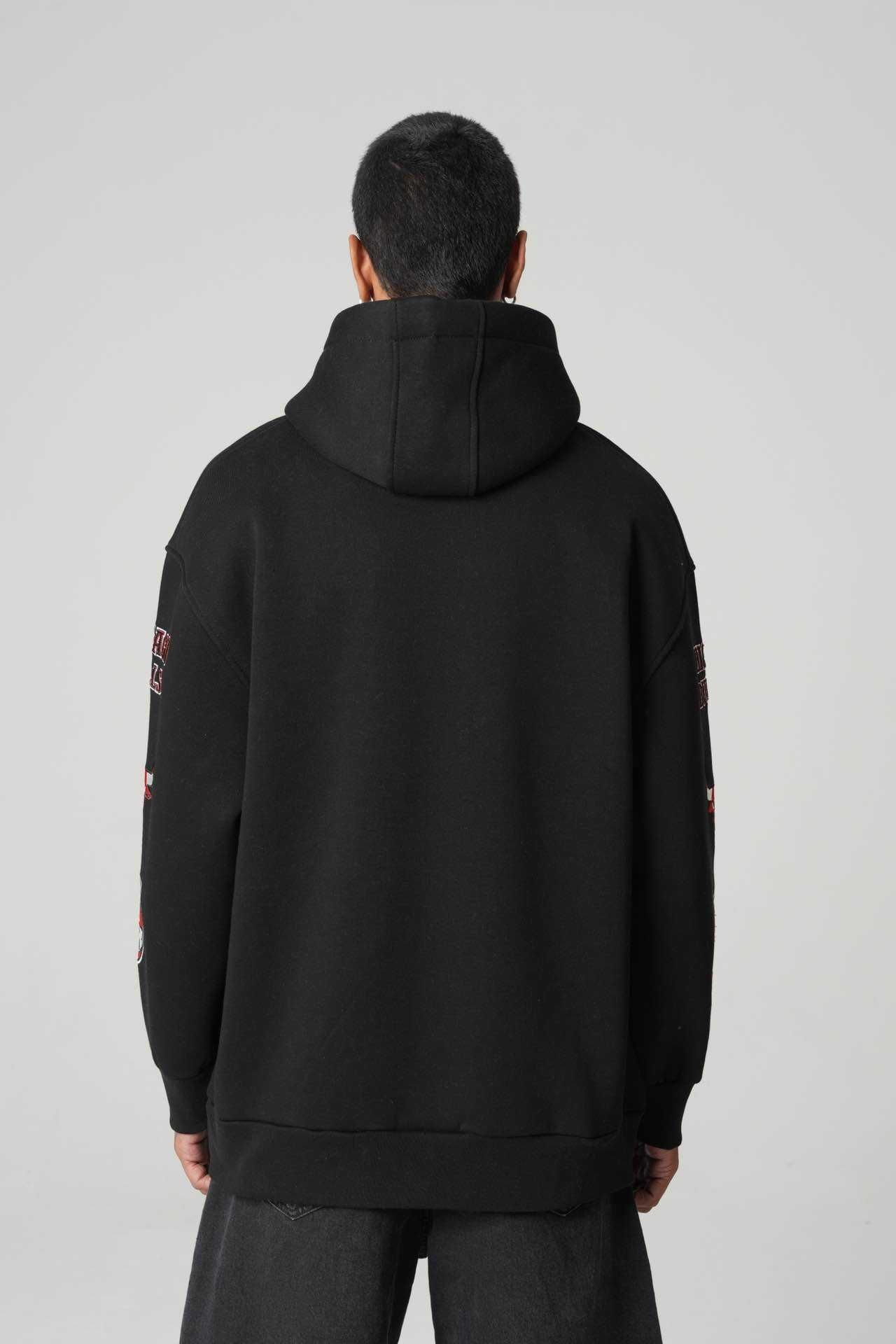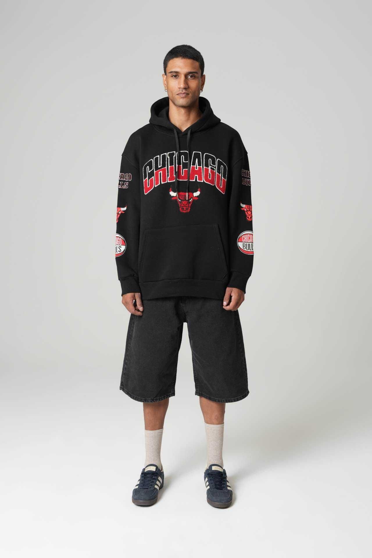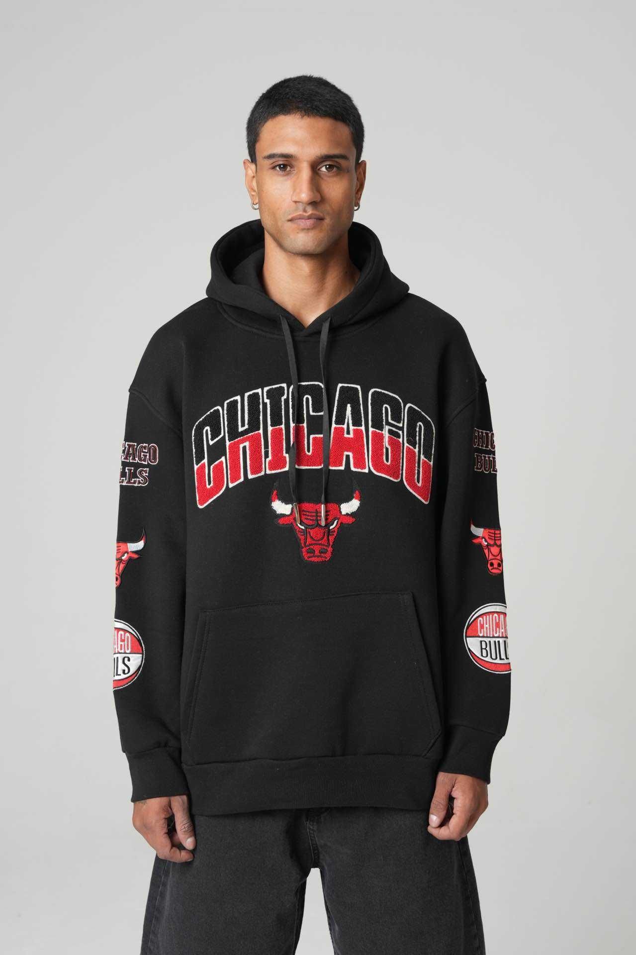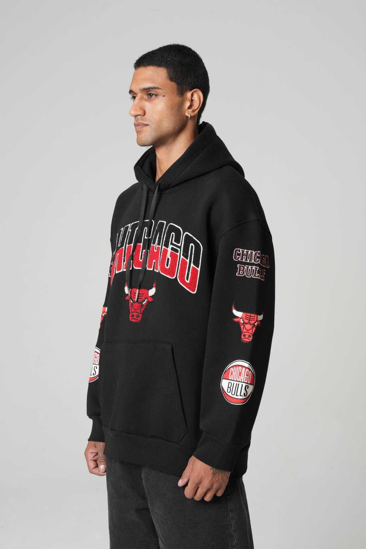 The Chicago Bulls Patchwork Hoodie is built for those who rep iconic style with confidence. Designed in a deep black base, this hoodie features bold CHICAGO embroidery with the Bulls logo on the front, while the sleeves are stacked with detailed Bulls patches that elevate the look.
