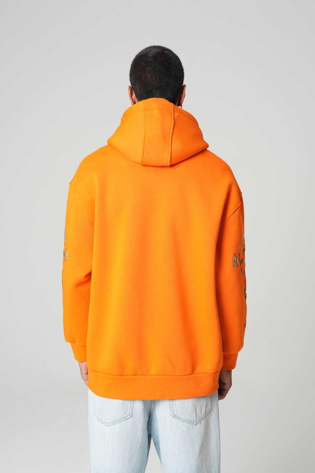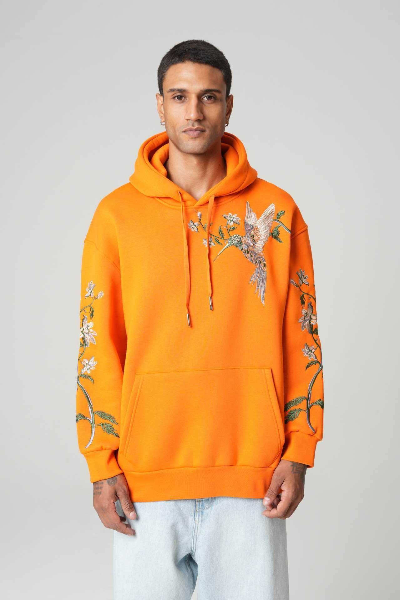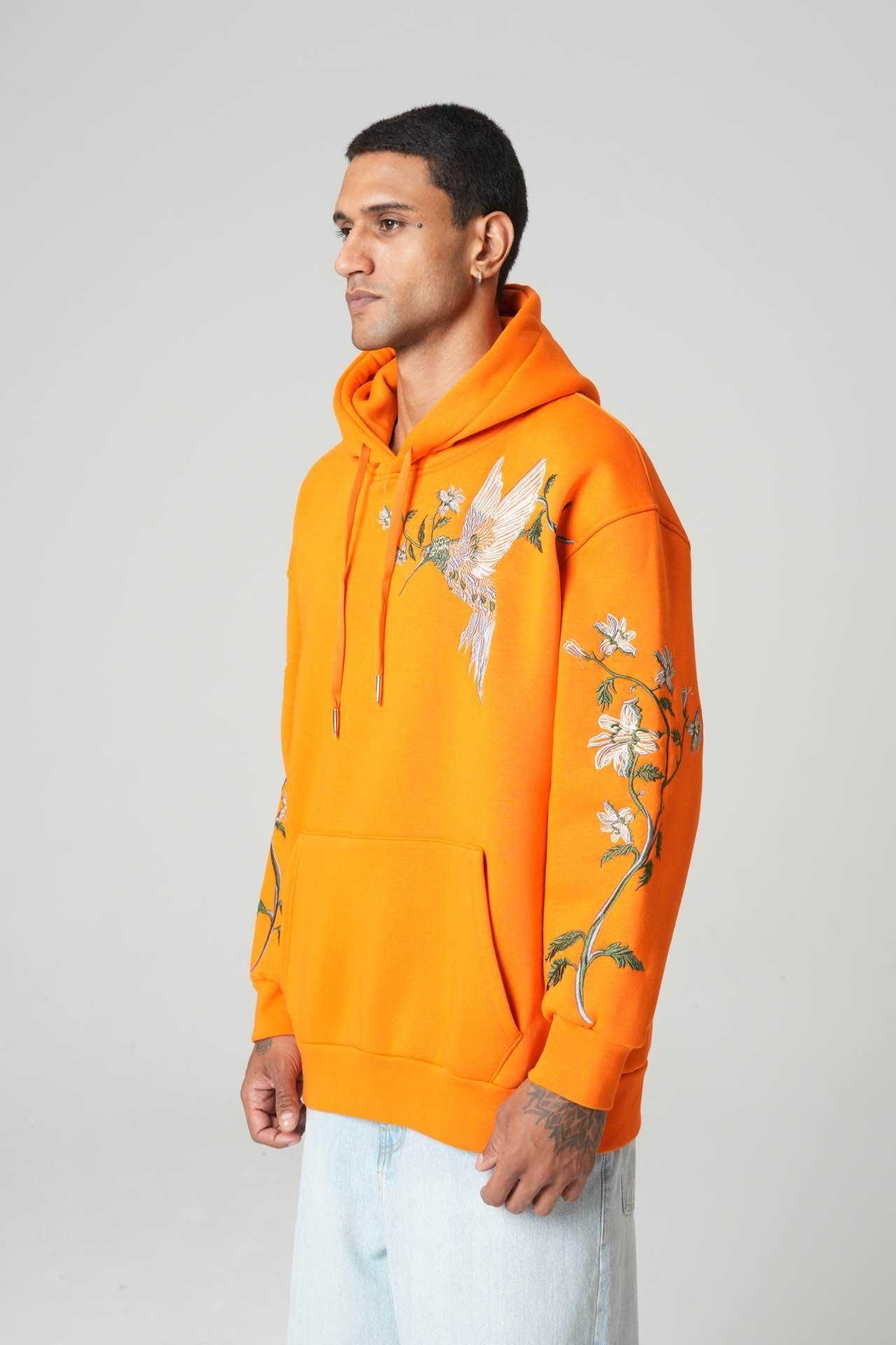 Introducing our Embroidered Hummingbird Floral Orange Hoodie, designed for those who love bold colours and detailed craftsmanship. This hoodie features a strikingly embroidered hummingbird on the front, complemented by floral embroidery running down both sleeves, giving it a unique, artistic streetwear look.