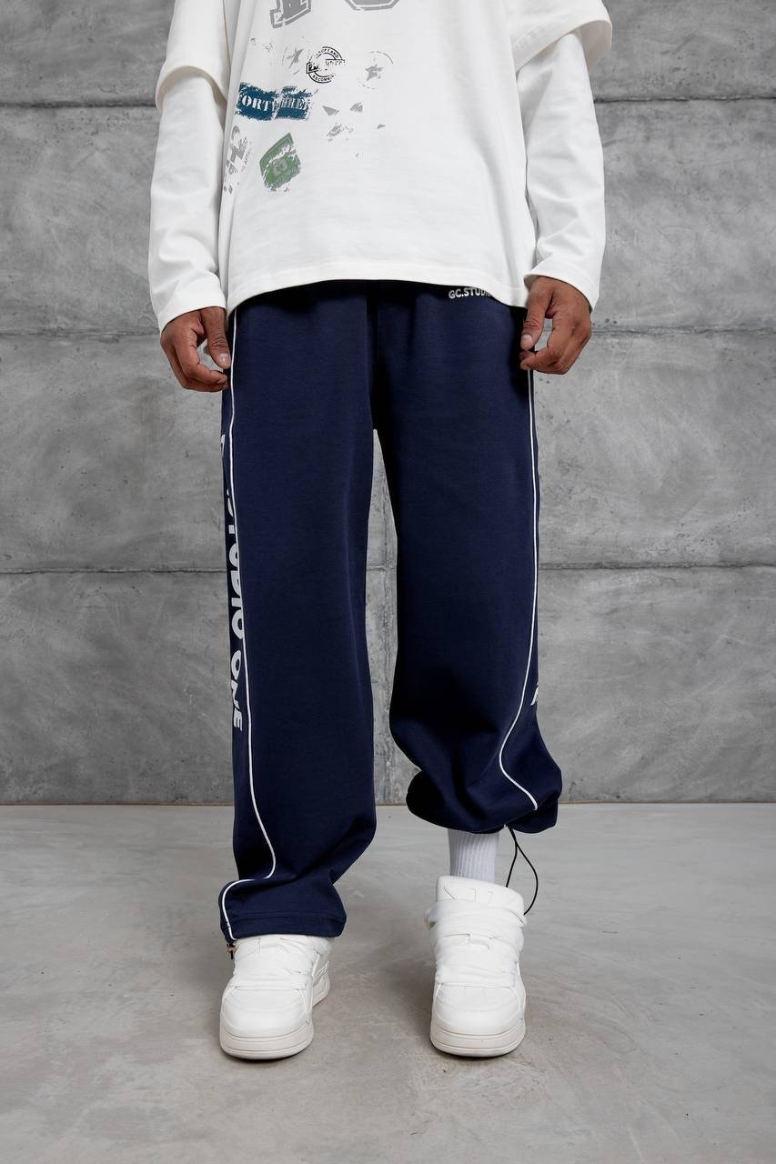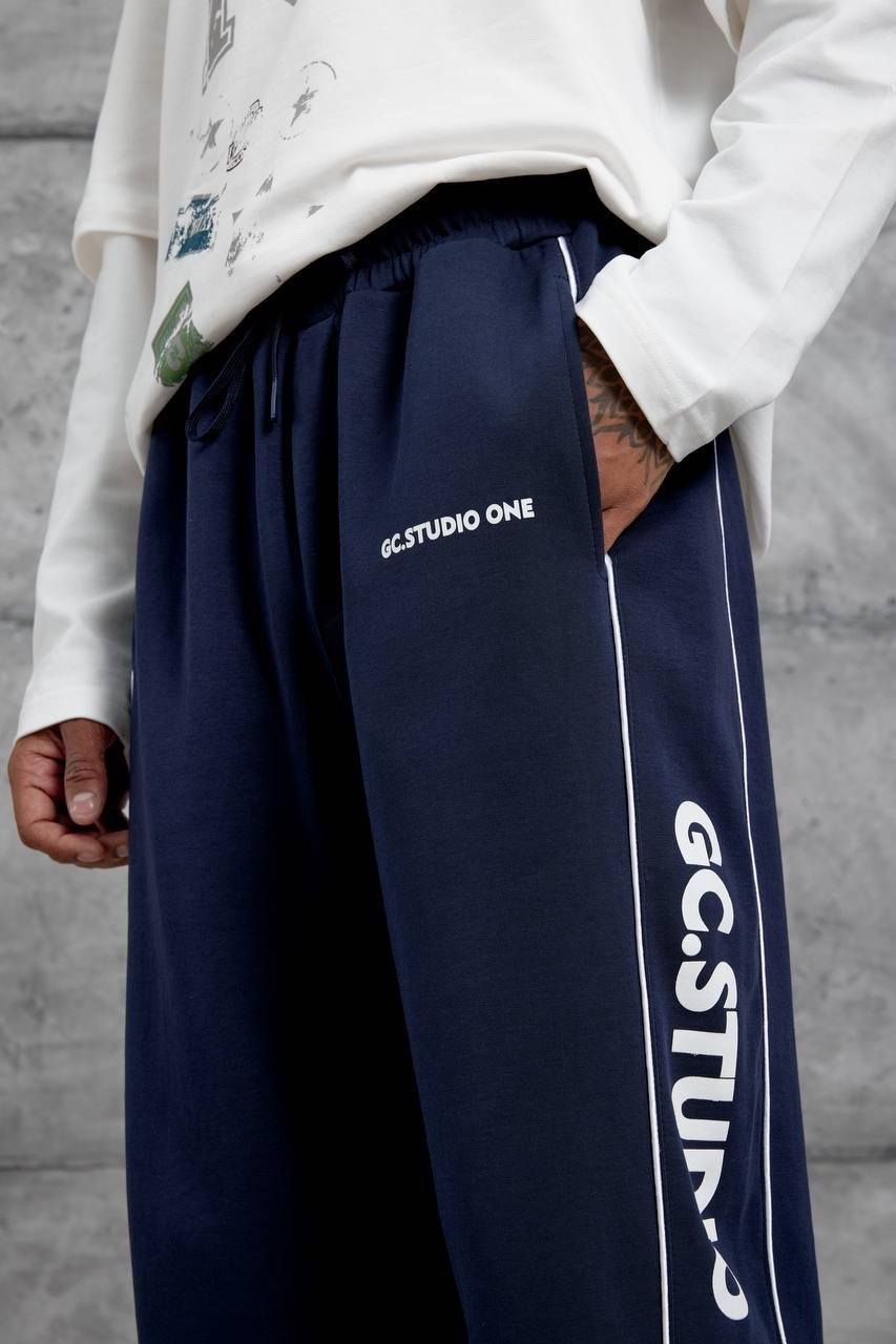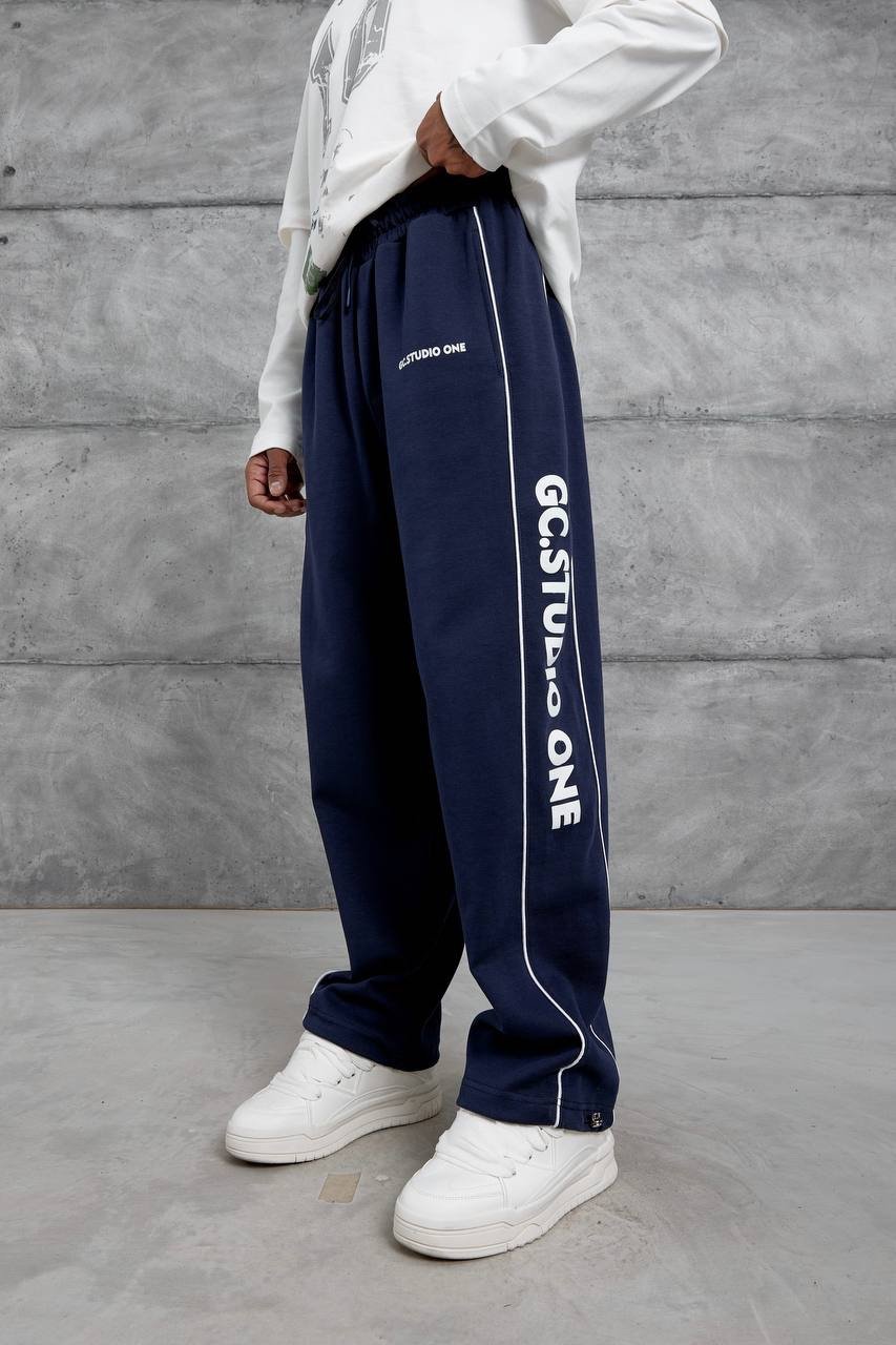 Premium navy blue trackpants with clean side piping and bold Studio One branding. Relaxed straight fit for everyday comfort and street-ready style.