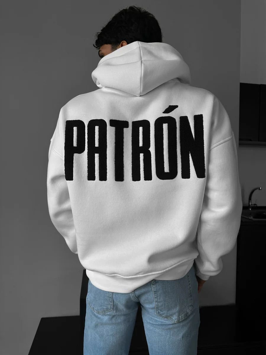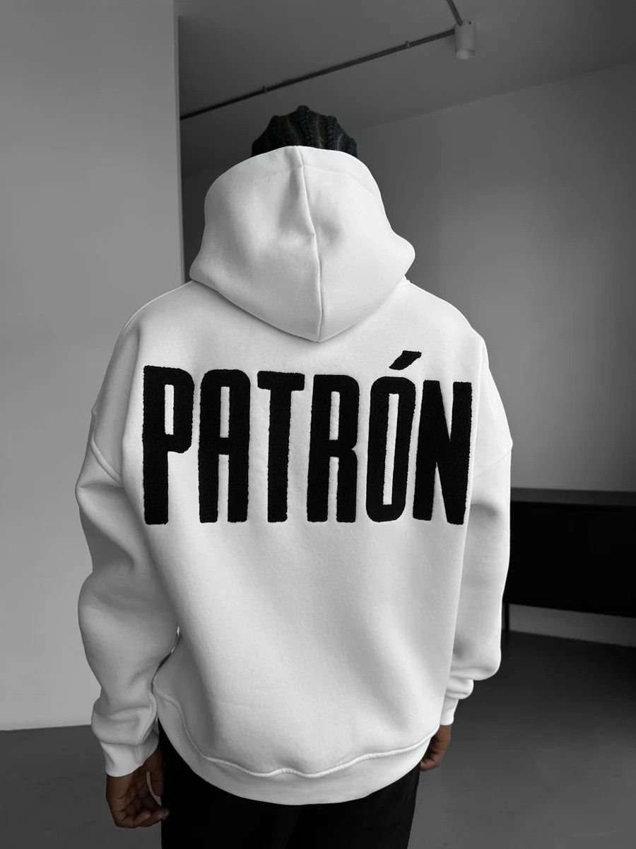 Unisex oversized white hoodie with small PATRÓN embroidery on the front and bold PATRÓN embroidery on the back. Premium, clean, and high-end streetwear.